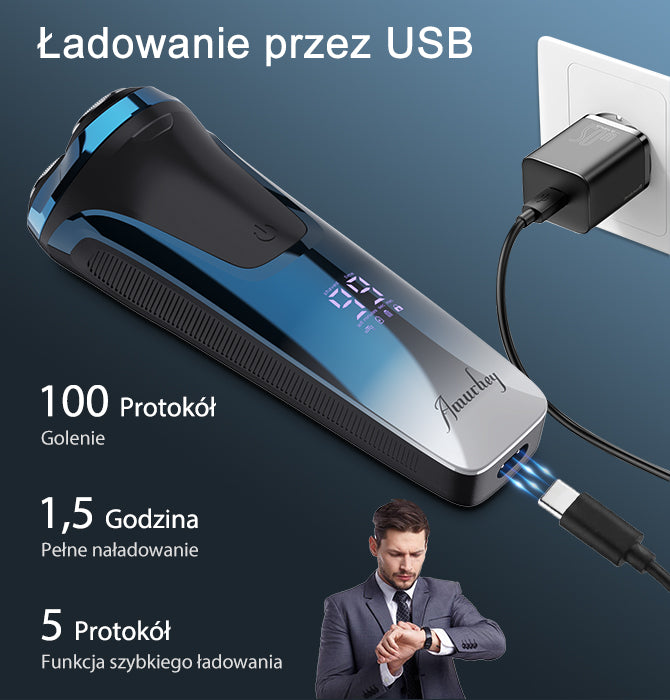 Golarkę można ładować z dowolnego standardowego źródła 5 V/1 A, takiego jak port USB w komputerze, powerbank lub ładowarka samochodowa. Uwaga: Urządzenie nie obsługuje szybkiego ładowania. Nie należy używać ładowarek do smartfonów o napięciu przekraczającym 5 V/2 A.